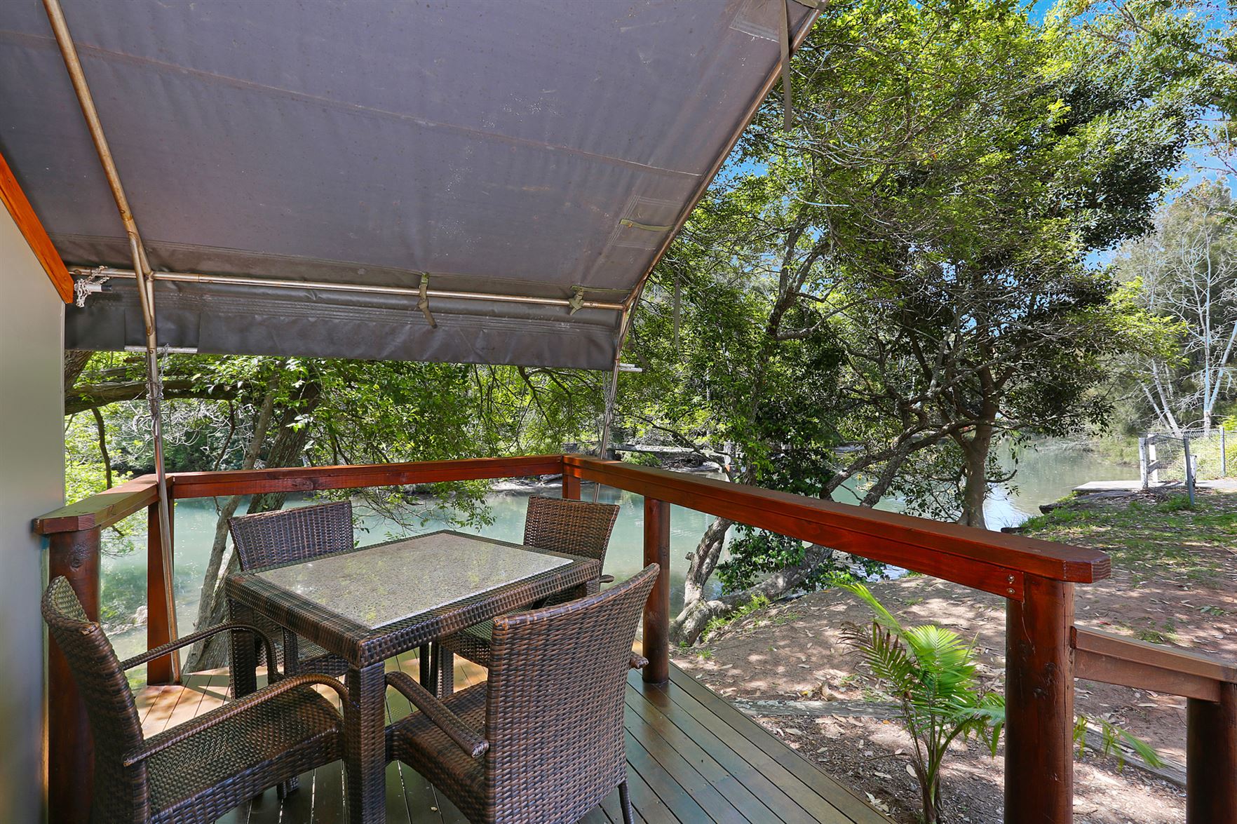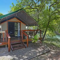 Our Safari Tents are in a tranquil riverfront location, with secluded river views. The Safari Tents include: a kitchenette with tea/coffee making facilities, kettle, toaster, small fridge, microwave. The tents have an ensuite bathroom with a toilet, shower, vanity and a luxurious claw foot bath. They all have wide front decks with outdoor settings and BBQs on each.